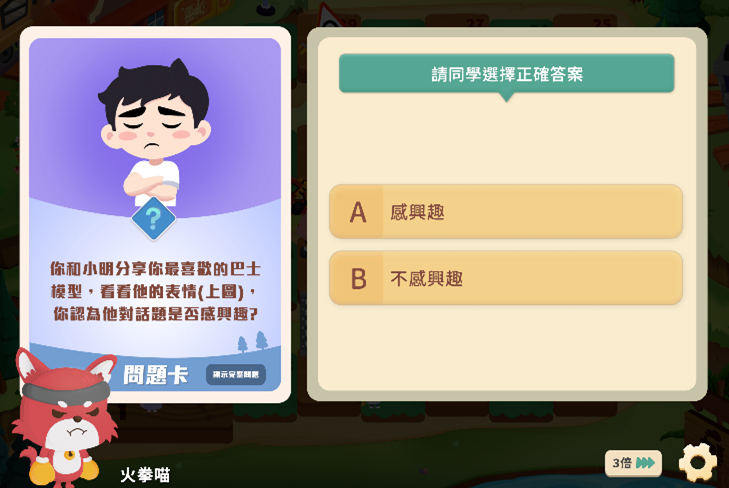 - 情緒管理:引導學生辨識及表達個人情緒,在面對不同的遊戲情境時可練習合宜的情緒調節策略。